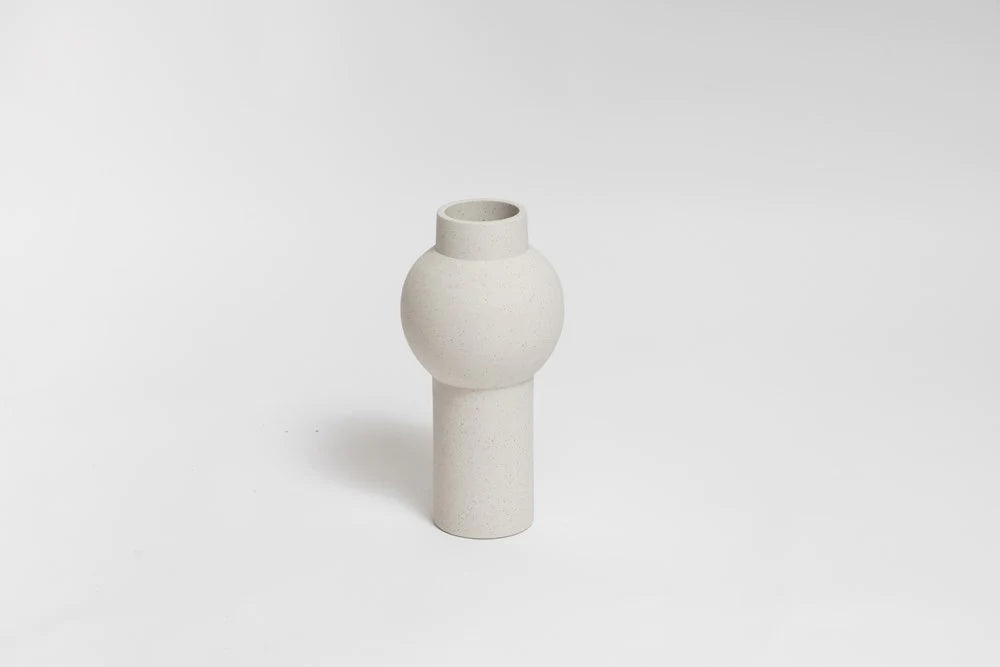 The Kansas Vase features a unique bobble shape and soft speckled pattern.